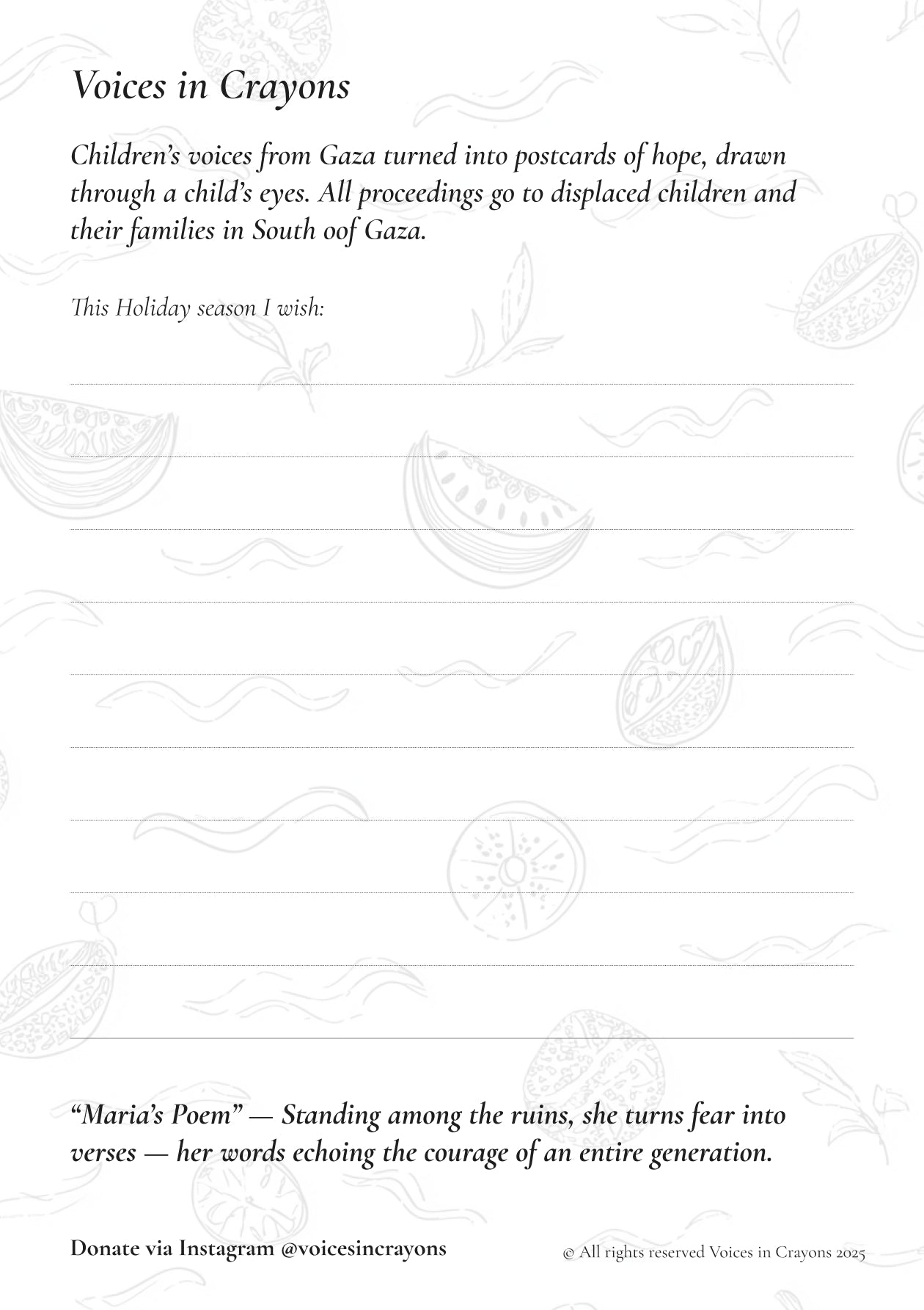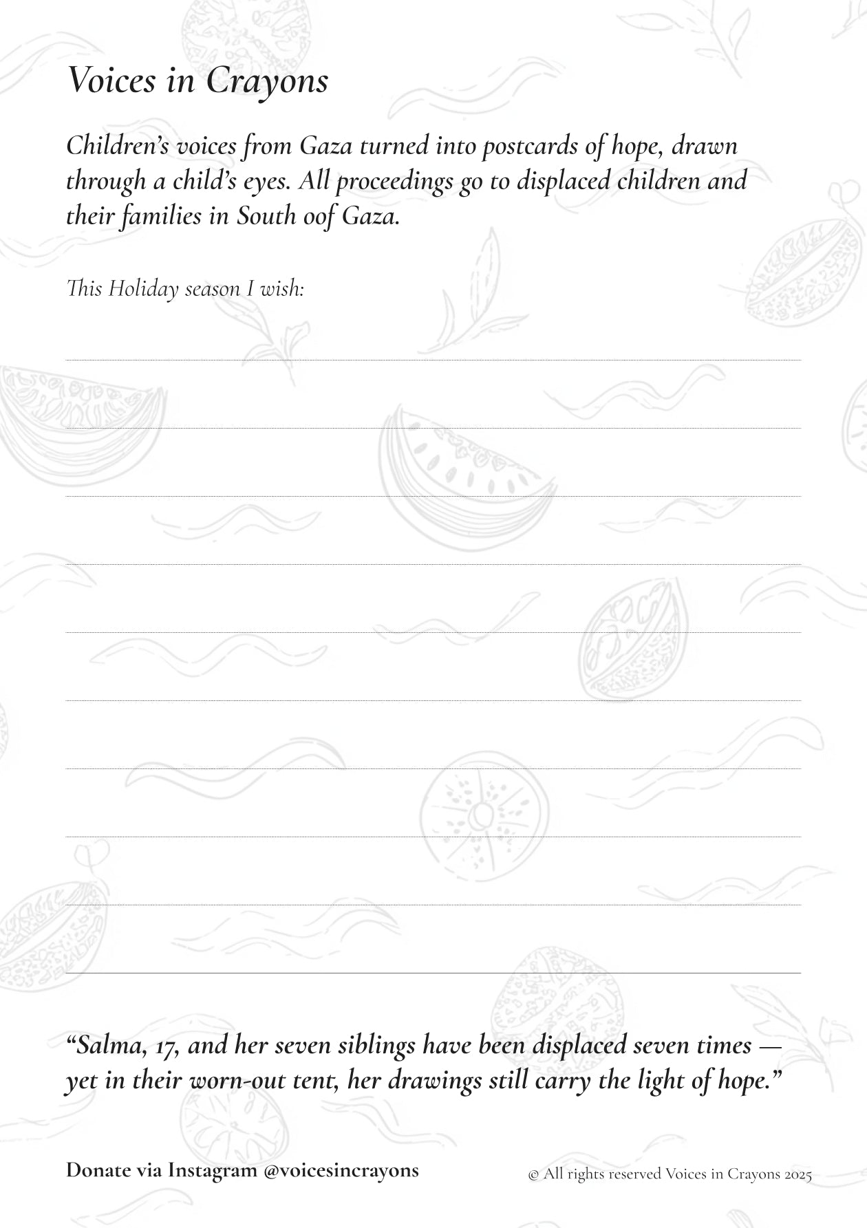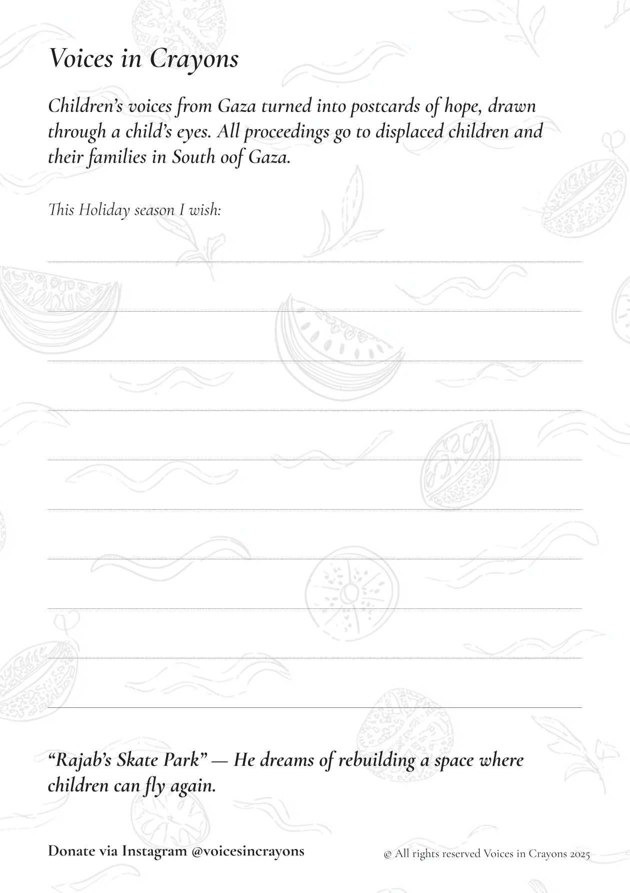 A set of three illustrated postcards born from the voices and stories of children in Gaza — transformed into gentle symbols of resilience, hope, and humanity.